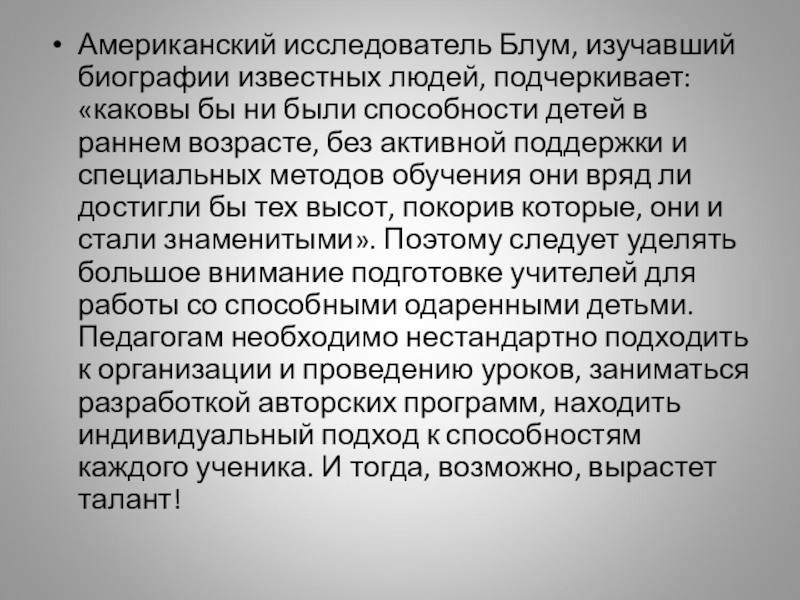 были способности детей в раннем возрасте, без активной поддержки и специальных методов обучения они вряд ли достигли бы тех высот, покорив которые, они и стали знаменитыми». Поэтому следует уделять большое внимание подготовке учителей для работы со способными одаренными детьми. Педагогам необходимо нестандартно подходить к организации и проведению уроков, заниматься разработкой авторских программ, находить индивидуальный подход к способностям каждого ученика. И тогда, возможно, вырастет талант!