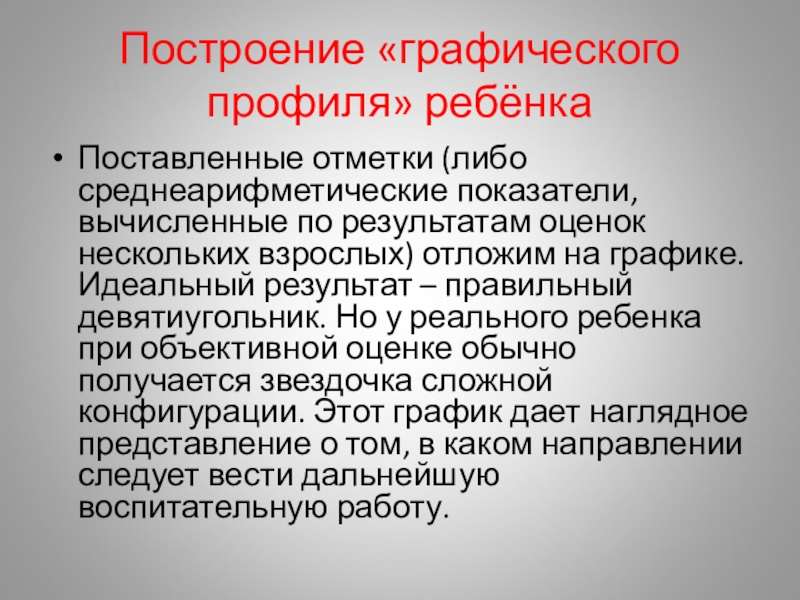оценок нескольких взрослых) отложим на графике. Идеальный результат – правильный девятиугольник. Но у реального ребенка при объективной оценке обычно получается звездочка сложной конфигурации. Этот график дает наглядное представление о том, в каком направлении следует вести дальнейшую воспитательную работу.