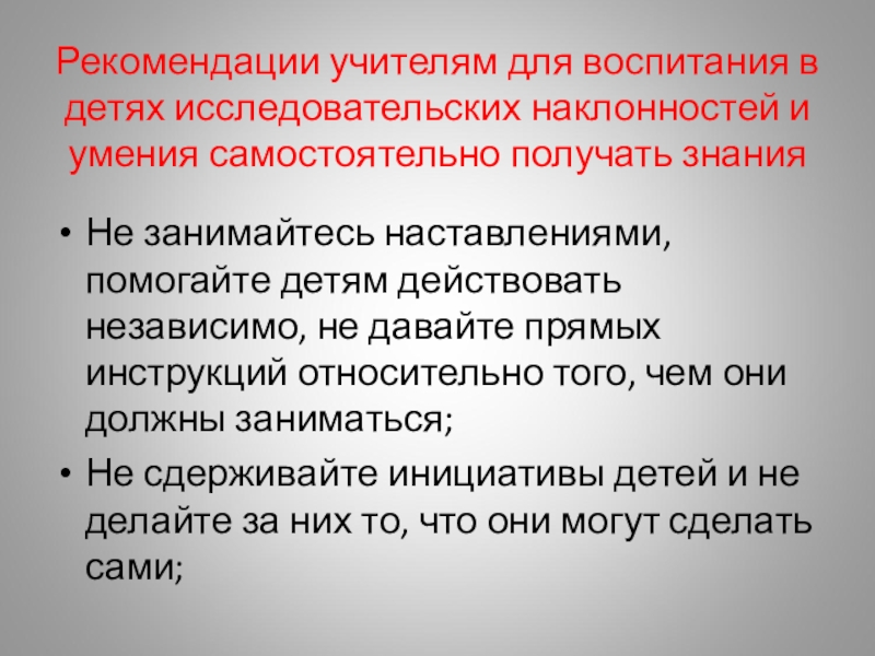 Слайд 22Рекомендации учителям для воспитания в детях исследовательских наклонностей и умения самостоятельно