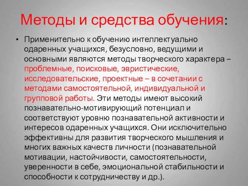 и основными являются методы творческого характера – проблемные, поисковые, эвристические, исследовательские, проектные – в сочетании с методами самостоятельной, индивидуальной и групповой работы. Эти методы имеют высокий познавательно-мотивирующий потенциал и соответствуют уровню познавательной активности и интересов одаренных учащихся. Они исключительно эффективны для развития творческого мышления и многих важных качеств личности (познавательной мотивации, настойчивости, самостоятельности, уверенности в себе, эмоциональной стабильности и способности к сотрудничеству и др.).