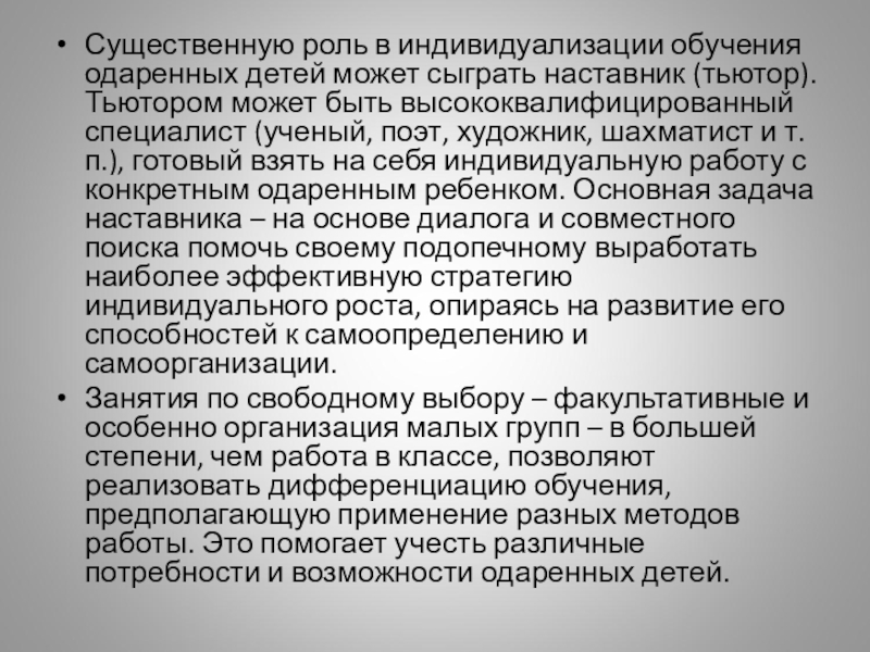Существенную роль в индивидуализации обучения одаренных детей может сыграть наставник (тьютор).