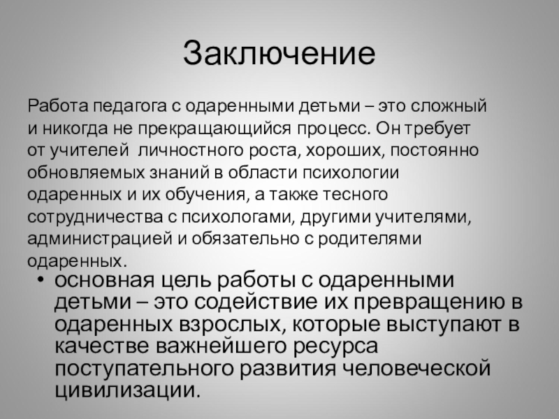 Работа педагога с одаренными детьми – это сложный и никогда не прекращающийся процесс. Он требует от учителей личностного роста, хороших, постоянно обновляемых знаний в области психологии одаренных и их обучения, а также тесного сотрудничества с психологами, другими учителями, администрацией и обязательно с родителями одаренных.