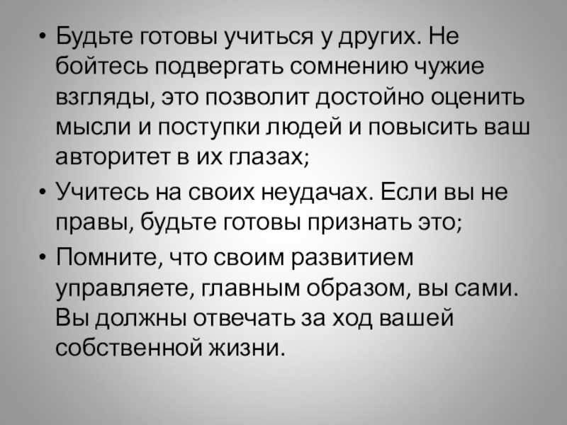 Будьте готовы учиться у других. Не бойтесь подвергать сомнению чужие взгляды,