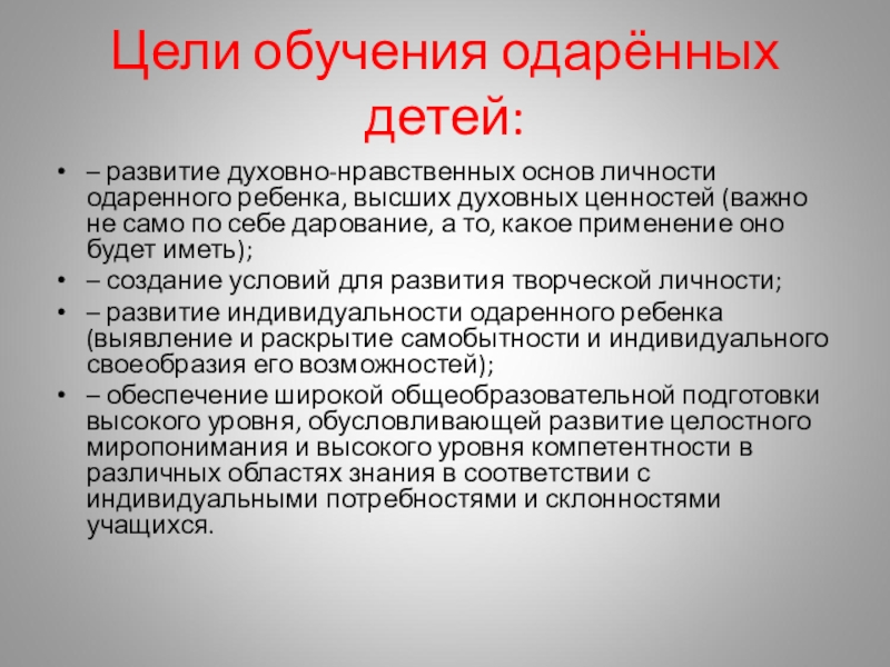 – развитие индивидуальности одаренного ребенка (выявление и раскрытие самобытности и индивидуального своеобразия его возможностей);