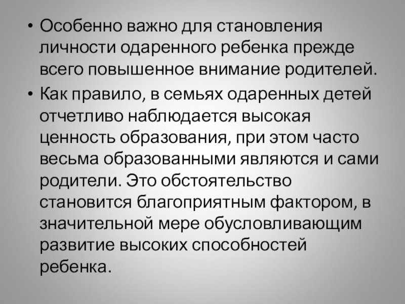 Как правило, в семьях одаренных детей отчетливо наблюдается высокая ценность образования, при этом часто весьма образованными являются и сами родители. Это обстоятельство становится благоприятным фактором, в значительной мере обусловливающим развитие высоких способностей ребенка.