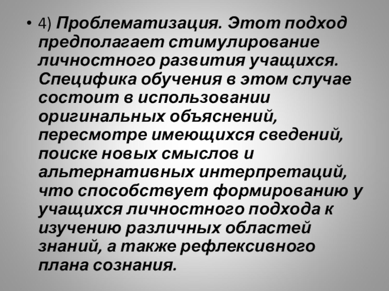 4) Проблематизация. Этот подход предполагает стимулирование личностного развития учащихся. Специфика обучения