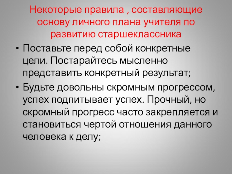 Слайд 24Некоторые правила , составляющие основу личного плана учителя по развитию старшеклассника