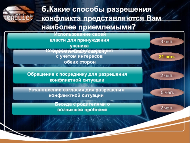 6.Какие способы разрешения конфликта представляются Вам наиболее приемлемыми?