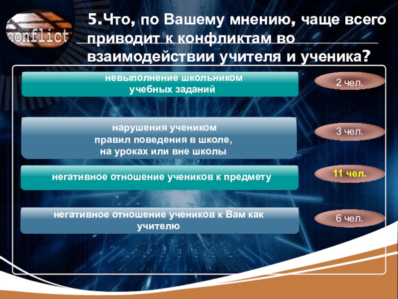 5.Что, по Вашему мнению, чаще всего приводит к конфликтам во взаимодействии учителя и ученика?