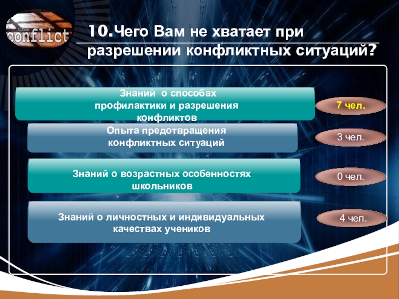 10.Чего Вам не хватает при разрешении конфликтных ситуаций?