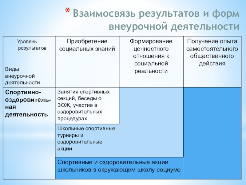 Слайд 110Взаимосвязь результатов и форм внеурочной деятельности
