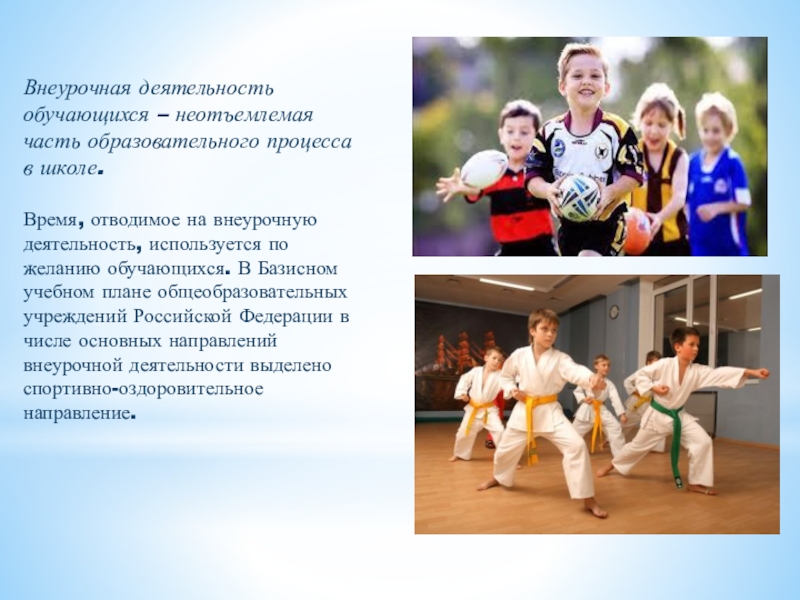 отводимое на внеурочную деятельность, используется по желанию обучающихся. В Базисном учебном плане общеобразовательных учреждений Российской Федерации в числе основных направлений внеурочной деятельности выделено спортивно-оздоровительное направление.