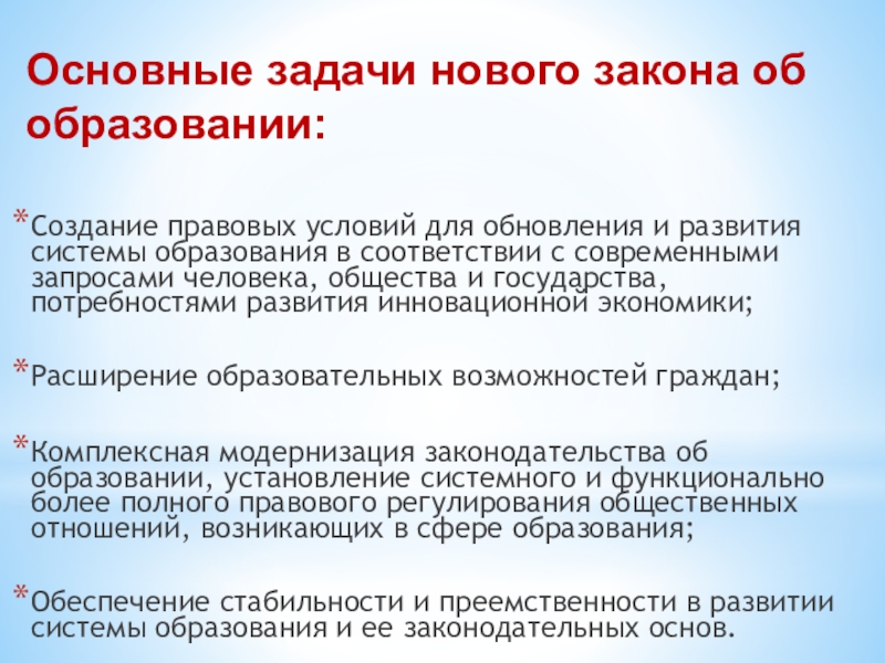Комплексная модернизация законодательства об образовании, установление системного и функционально более полного правового регулирования общественных отношений, возникающих в сфере образования;