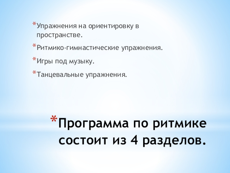 Слайд 103Программа по ритмике состоит из 4 разделов.