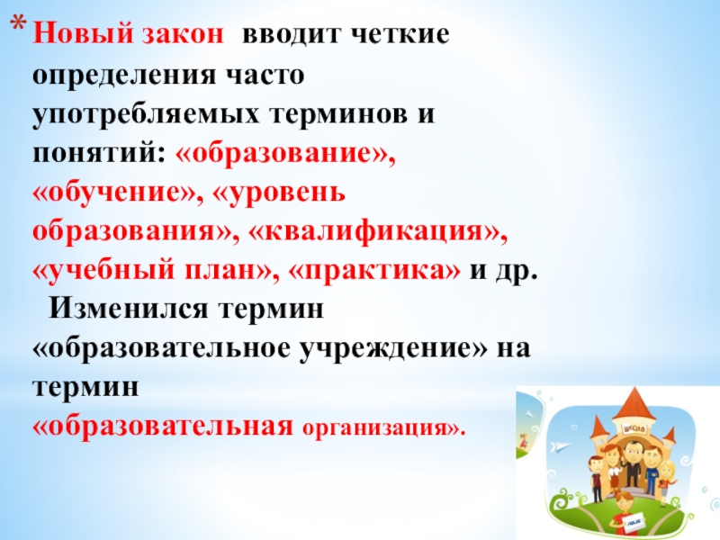 Слайд 19Новый закон вводит четкие определения часто употребляемых терминов и понятий: «образование»,