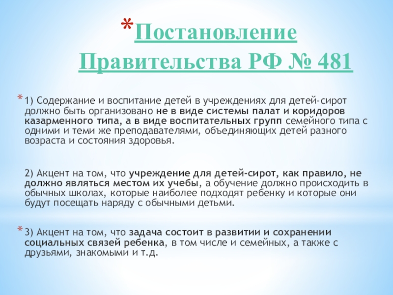 Постановление Правительства РФ № 481 «О деятельности организаций для детей-сирот и детей, оставшихся без попечения родителей» от 24.05.2014 года, вступило в законную силу с 1 сентября 2015 года.