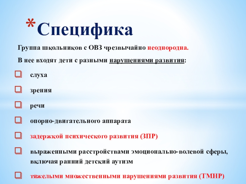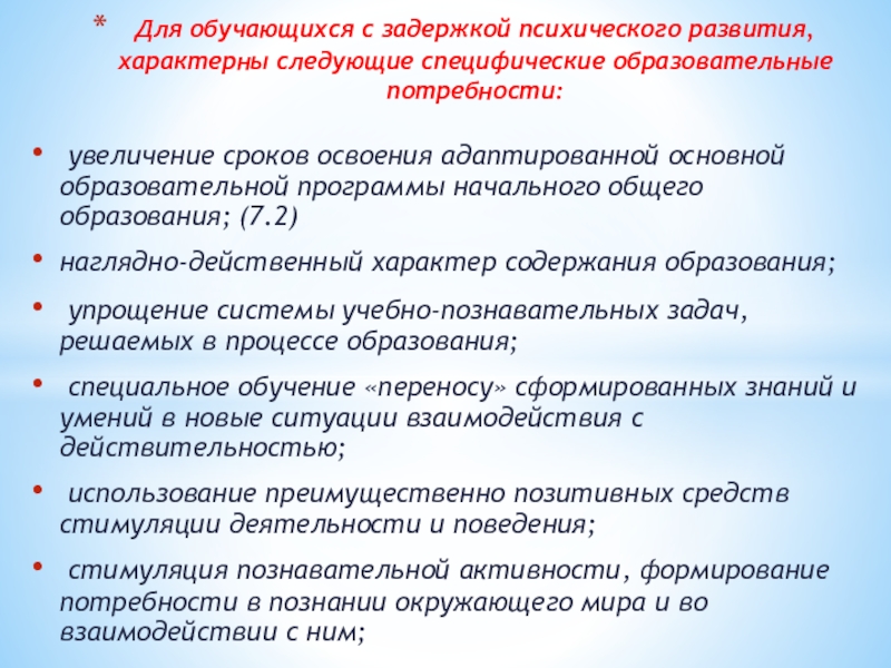 Для обучающихся с задержкой психического развития, характерны следующие специфические образовательные потребности: