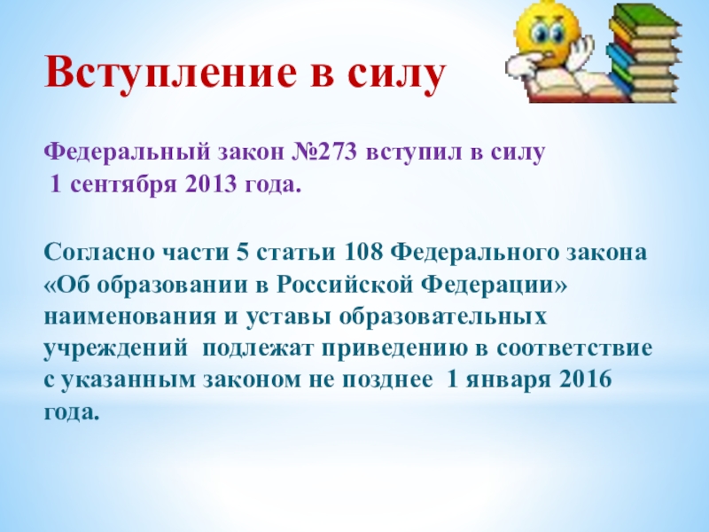 Согласно части 5 статьи 108 Федерального закона «Об образовании в Российской Федерации» наименования и уставы образовательных учреждений подлежат приведению в соответствие с указанным законом не позднее 1 января 2016 года.
