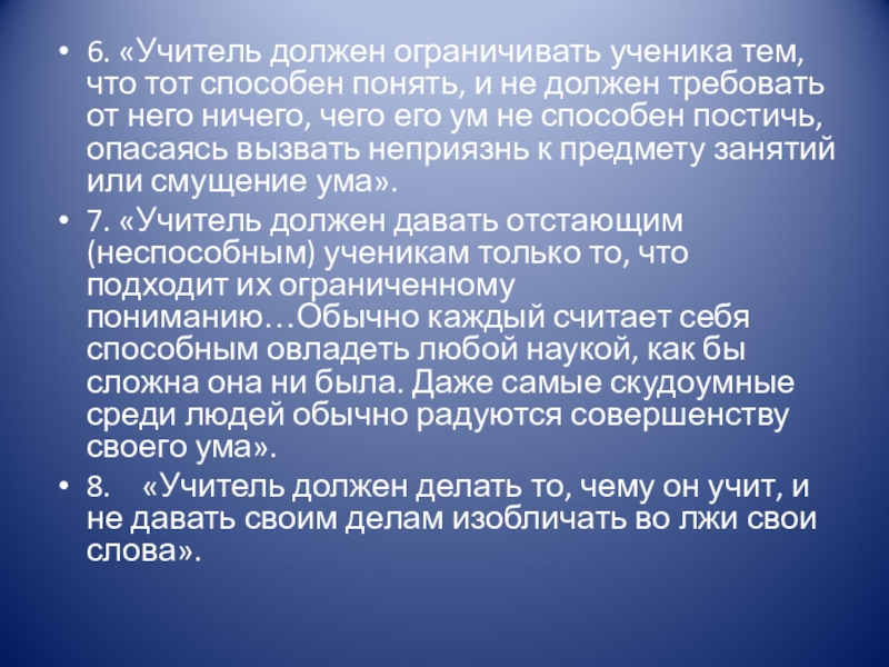 7. «Учитель должен давать отстающим (неспособным) ученикам только то, что подходит их ограниченному пониманию…Обычно каждый считает себя способным овладеть любой наукой, как бы сложна она ни была. Даже самые скудоумные среди людей обычно радуются совершенству своего ума».