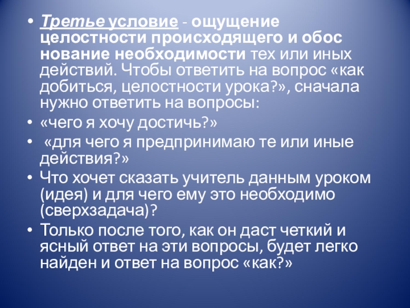 Третье условие - ощущение целостности происходящего и обоснование необходимости тех или