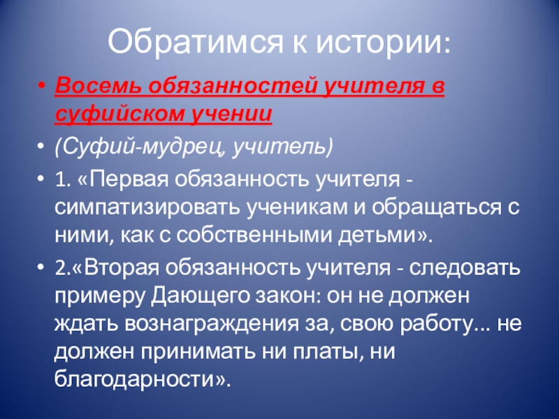 2.«Вторая обязанность учителя - следовать примеру Дающего закон: он не должен ждать вознаграждения за, свою работу... не должен принимать ни платы, ни благодарности».