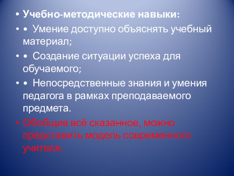 • Непосредственные знания и умения педагога в рамках преподаваемого предмета.