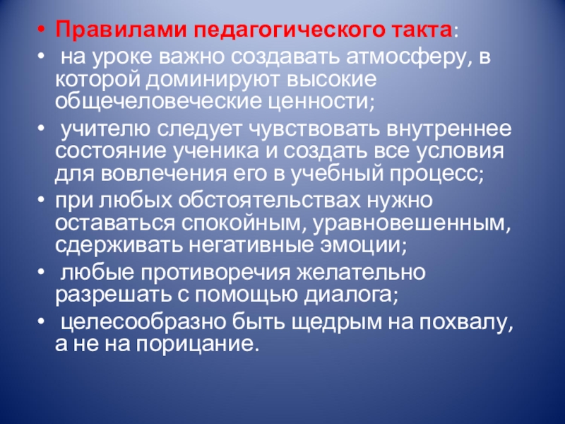 уважительное отношение к ребенку, умение слушать и слышать его, сопереживание(эмпатия), внимательность, чуткость (без стремления афишировать свои действия), дружелюбие без панибратства, доброжелательность, умение увлекать воспитанников идеей. Чтобы быть тактичным, учителю необходимо быть наблюдательным, уметь предвидеть все возможные последствия своих слов и поступков.