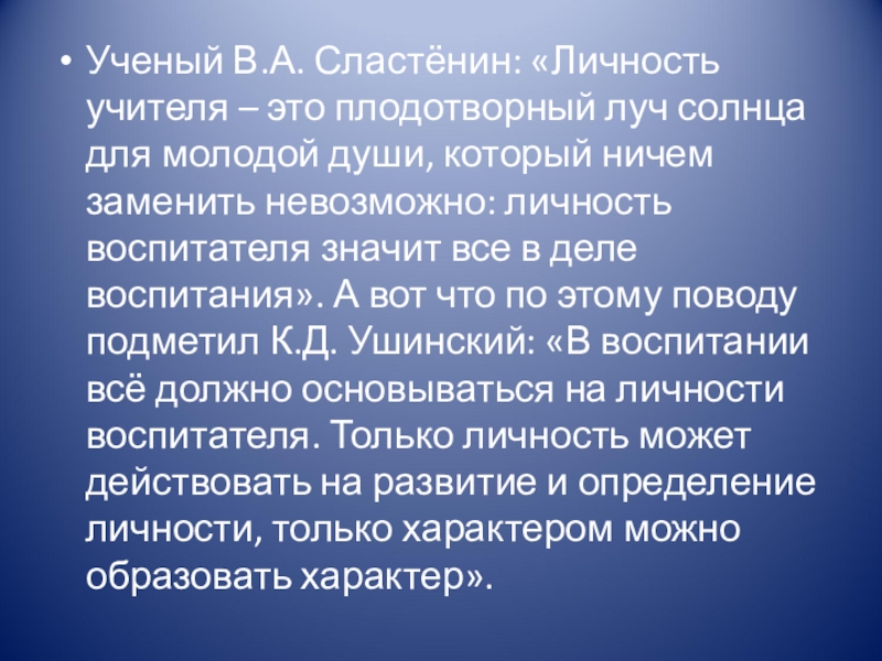 молодой души, который ничем заменить невозможно: личность воспитателя значит все в деле воспитания». А вот что по этому поводу подметил К.Д. Ушинский: «В воспитании всё должно основываться на личности воспитателя. Только личность может действовать на развитие и определение личности, только характером можно образовать характер».