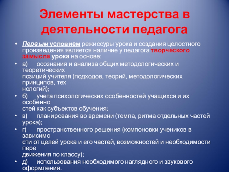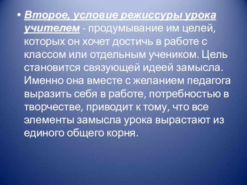 Второе, условие режиссуры урока учителем - продумывание им целей, которых он