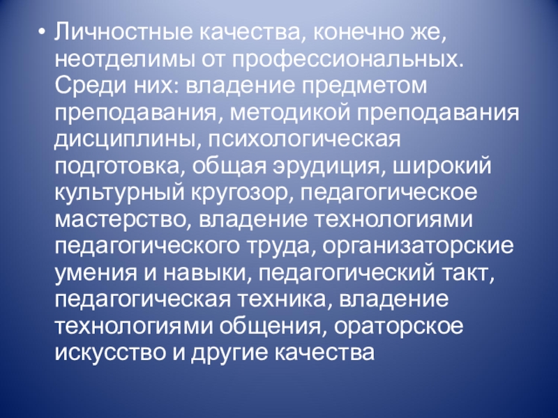 Личностные качества, конечно же, неотделимы от профессиональных. Среди них: владение предметом
