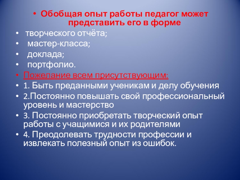 3. Постоянно приобретать творческий опыт работы с учащимися и их родителями