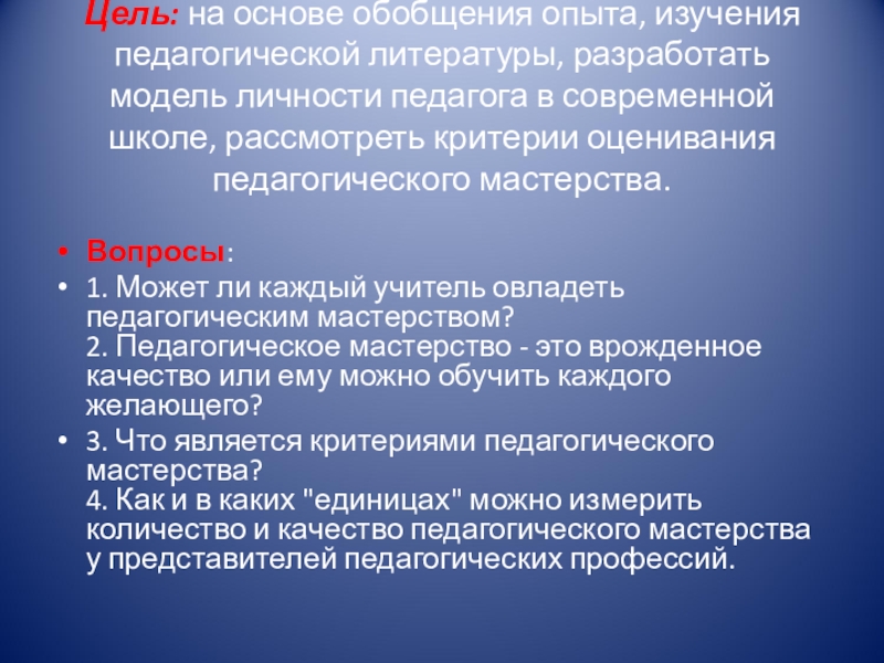 Слайд 2Цель: на основе обобщения опыта, изучения педагогической литературы, разработать модель личности педагога