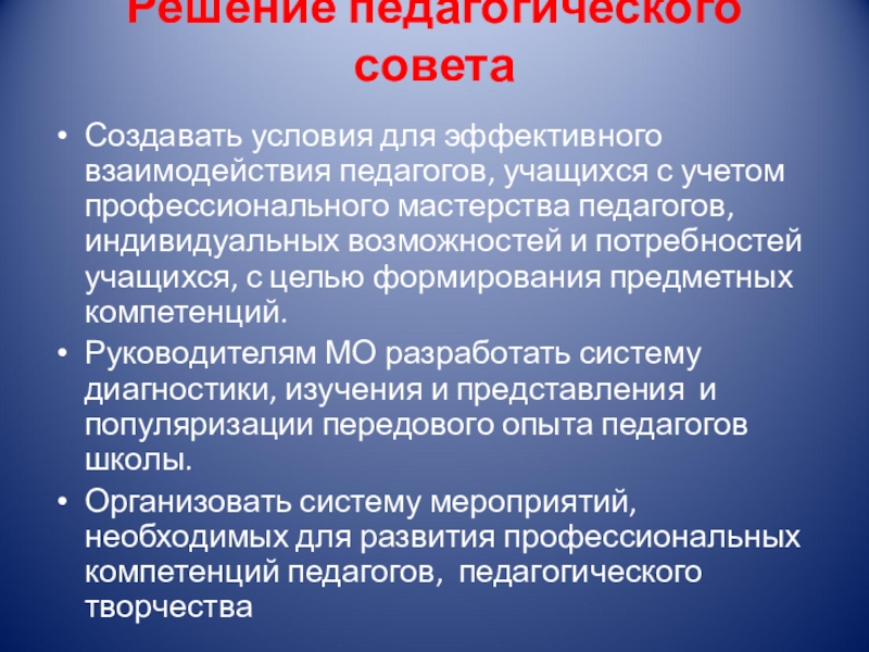 Создавать условия для эффективного взаимодействия педагогов, учащихся с учетом