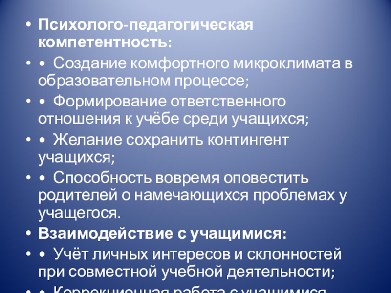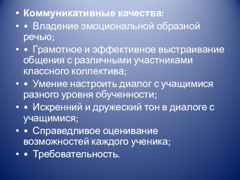 • Умение настроить диалог с учащимися разного уровня обученности;