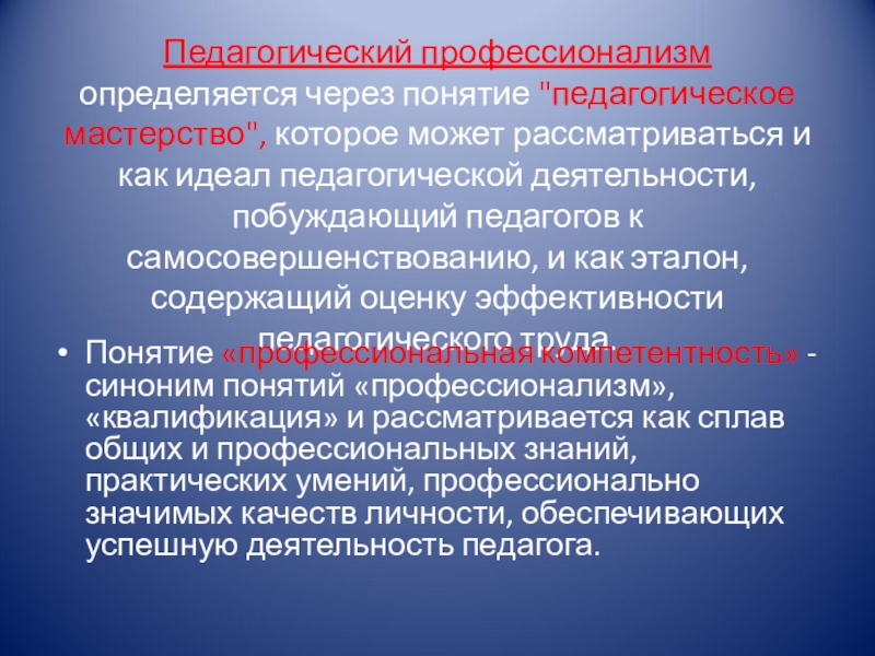 Слайд 12Педагогический профессионализм определяется через понятие "педагогическое мастерство", которое может рассматриваться и