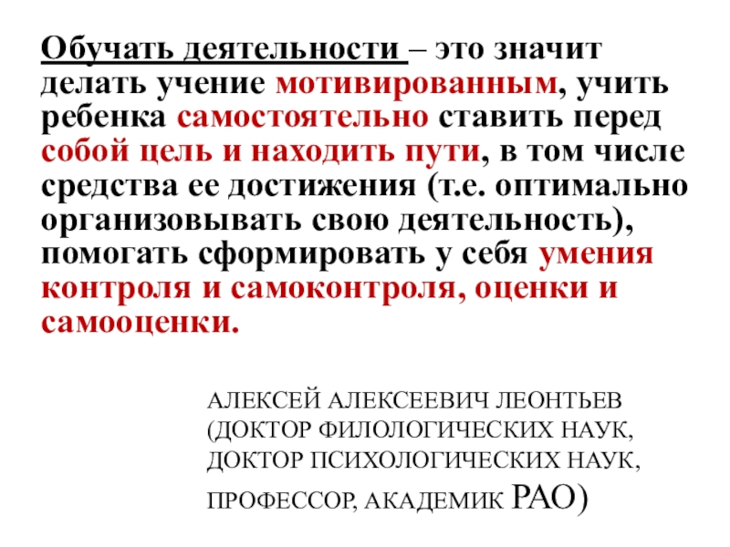 Обучать деятельности – это значит делать учение мотивированным, учить ребенка самостоятельно ставить перед собой цель и находить пути, в том числе средства ее достижения (т.е. оптимально организовывать свою деятельность), помогать сформировать у себя умения контроля и самоконтроля, оценки и самооценки.