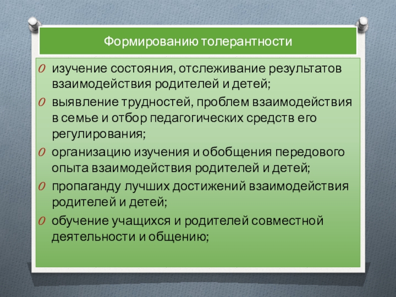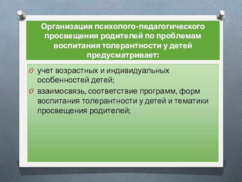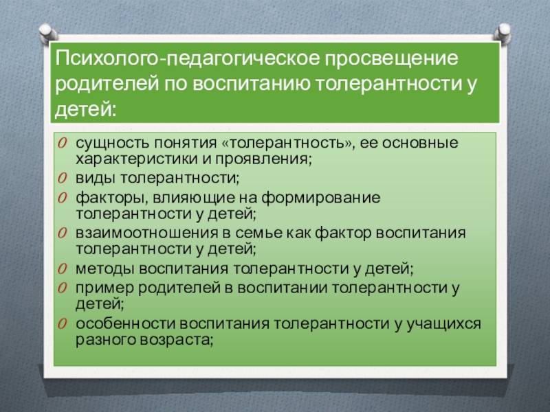 Слайд 11Организация психолого-педагогического просвещения родителей по проблемам воспитания толерантности у детей предусматривает: