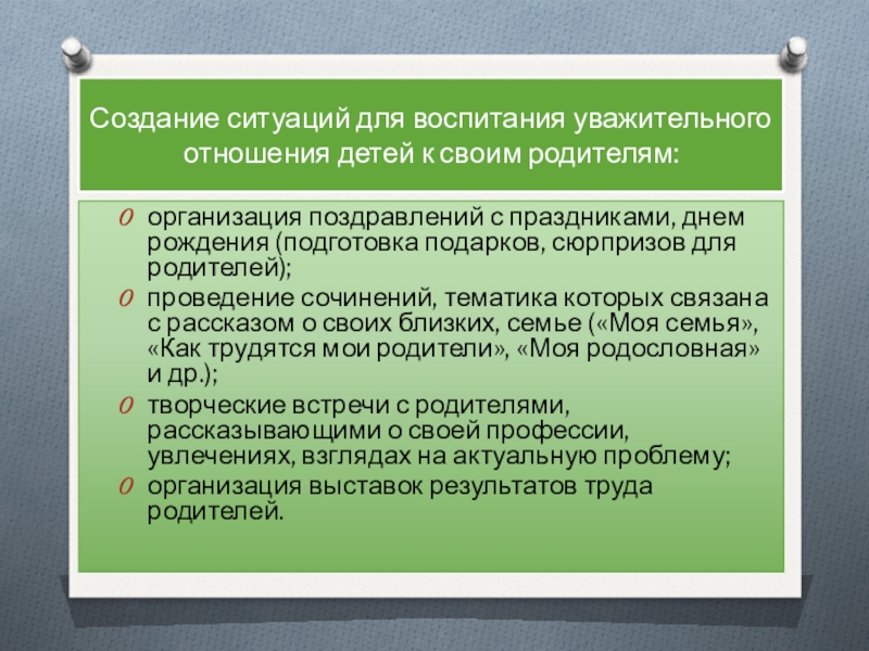 Слайд 16Создание ситуаций для воспитания уважительного отношения детей к своим родителям: