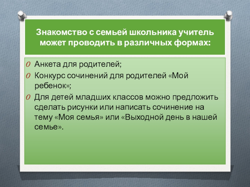 Слайд 9Знакомство с семьей школьника учитель может проводить в различных формах: