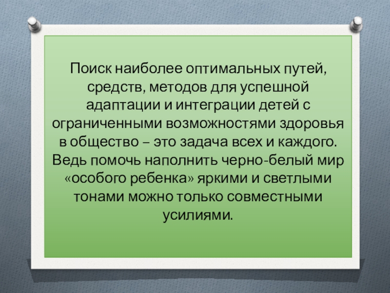 детей с ограниченными возможностями здоровья в общество – это задача всех и каждого. Ведь помочь наполнить черно-белый мир «особого ребенка» яркими и светлыми тонами можно только совместными усилиями.