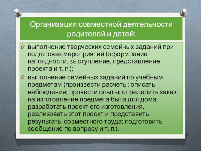 выполнение семейных заданий по учебным предметам (произвести расчеты; описать наблюдения; провести опыты; определить заказ на изготовление предмета быта для дома, разработать проект его изготовления, реализовать этот проект и представить результаты совместного труда; подготовить сообщение по вопросу и т. п.).