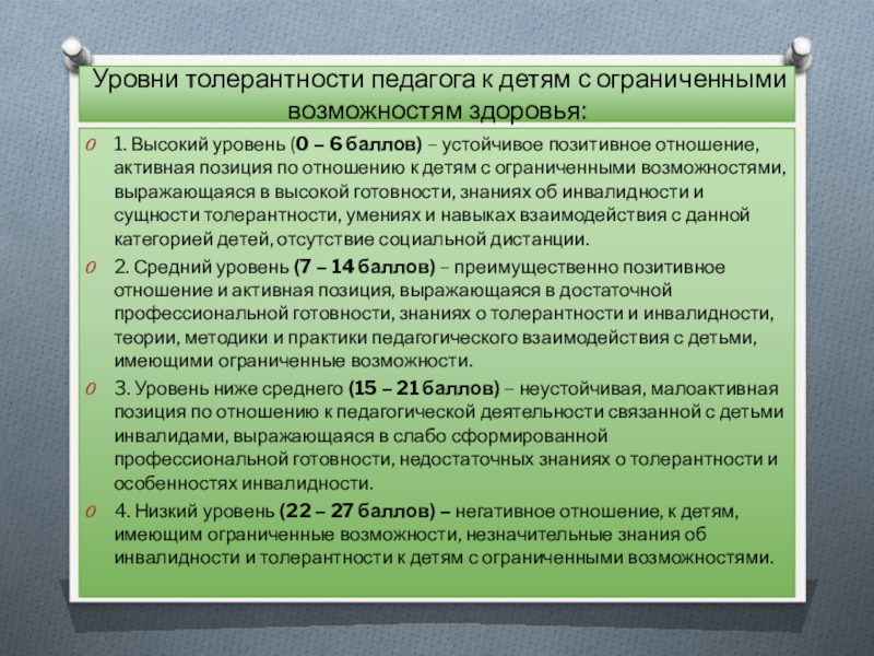 Слайд 31Уровни толерантности педагога к детям с ограниченными возможностям здоровья: