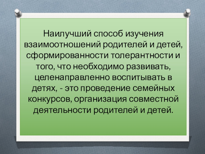 Слайд 10Наилучший способ изучения взаимоотношений родителей и детей, сформированности толерантности и того,