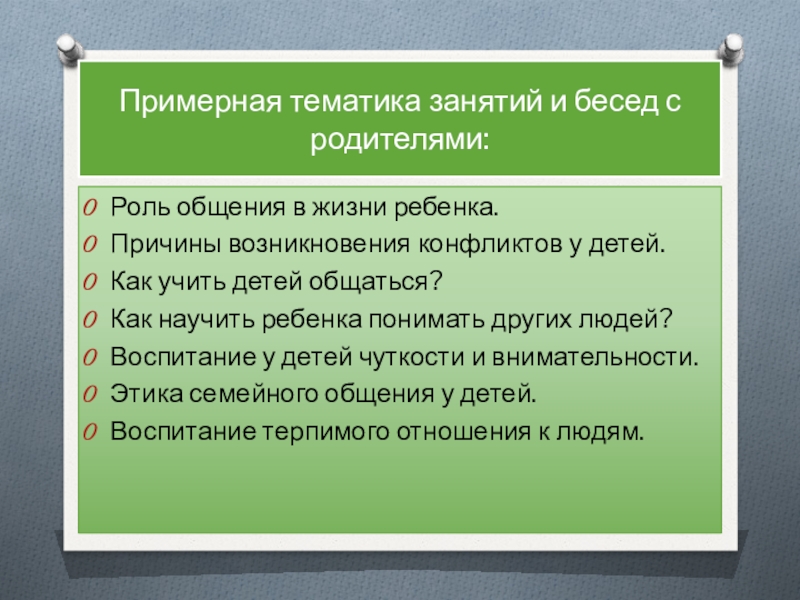 Слайд 13Примерная тематика занятий и бесед с родителями: