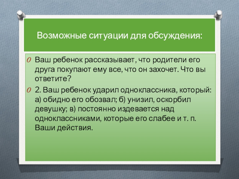 2. Ваш ребенок ударил одноклассника, который: а) обидно его обозвал; б) унизил, оскорбил девушку; в) постоянно издевается над одноклассниками, которые его слабее и т. п. Ваши действия.