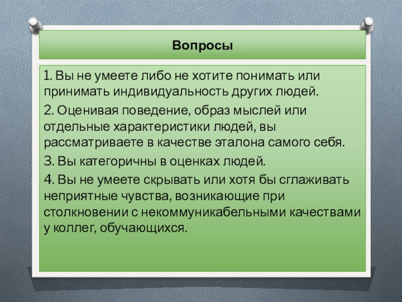 2. Оценивая поведение, образ мыслей или отдельные характеристики людей, вы рассматриваете в качестве эталона самого себя.