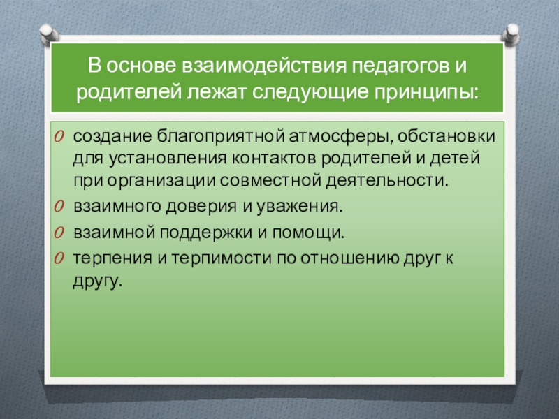 Слайд 8В основе взаимодействия педагогов и родителей лежат следующие принципы: