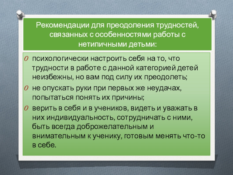 психологически настроить себя на то, что трудности в работе с данной категорией детей неизбежны, но вам под силу их преодолеть;