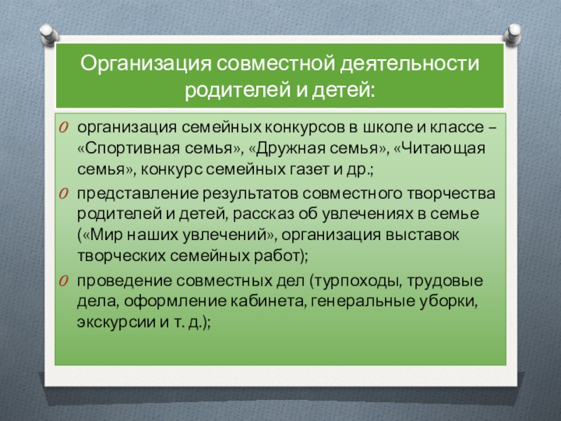 атмосферы, обстановки для установления контактов родителей и детей при организации совместной деятельности.