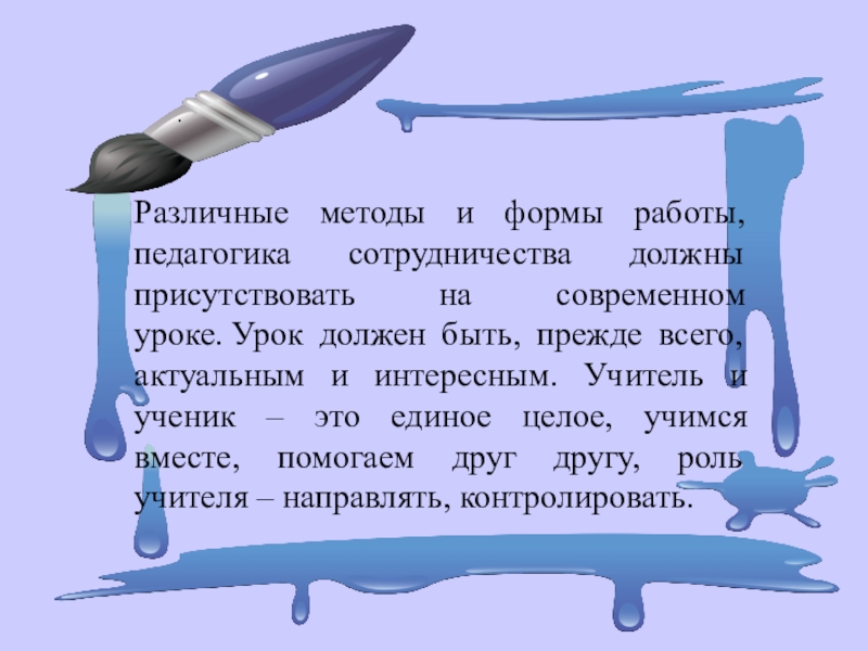 уроке. Урок должен быть, прежде всего, актуальным и интересным. Учитель и ученик – это единое целое, учимся вместе, помогаем друг другу, роль учителя – направлять, контролировать.